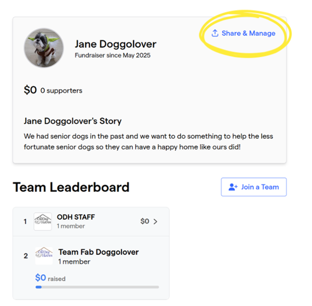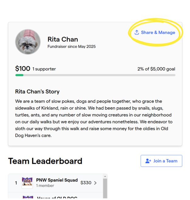☑️ Click on the “Share & Manage” link on the top right of your story to return to your fundraiser dashboard where you can share, invite donors, see your list of supporters, and edit your profile for this fundraiser.